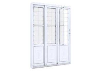 Porta de correr lateral 2 fls móveis e 1 fixa, de aço com postigo grade quadrada. Ullian Riobras Aço Pronto