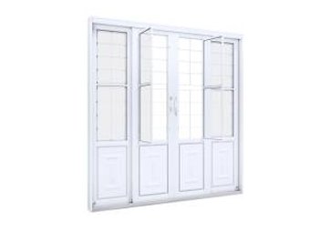Porta de correr central de aço com postigo 2 fls móveis e 2 fixas com grade. Ullian Riobras Aço Pronto